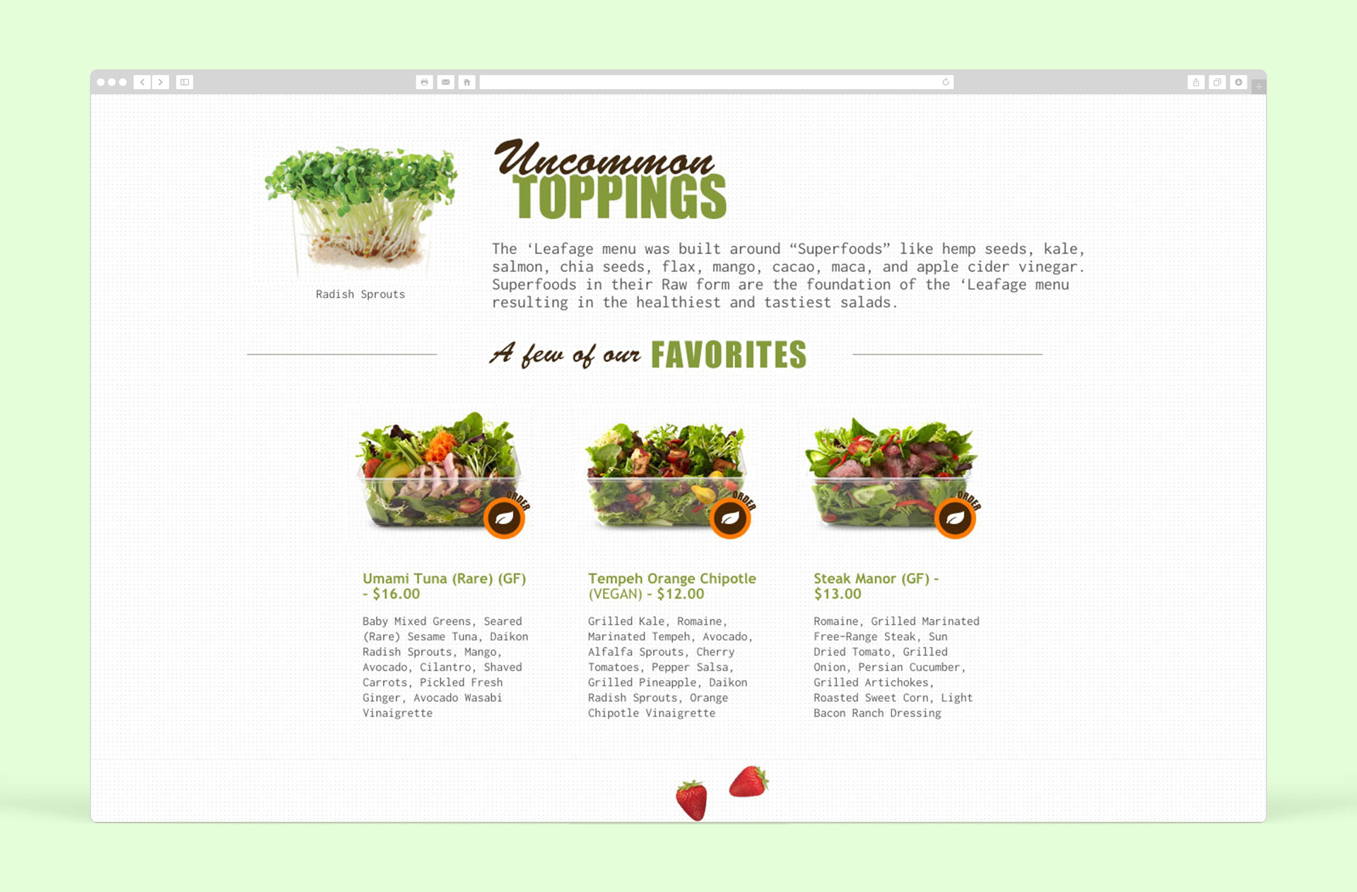 'Leafage focus on healthy, high-quality ingredients including many “super foods” that would help power busy office dwellers through their hectic days. It started with market research that included where, when and how customers wanted their food. The resulting customizable menu of entrees, juices and smoothies delivers everyone’s daily requirements.